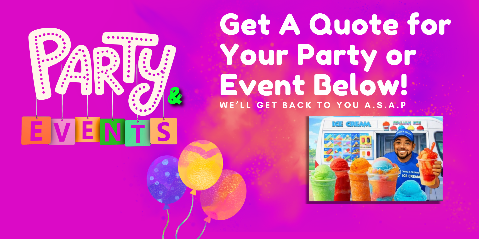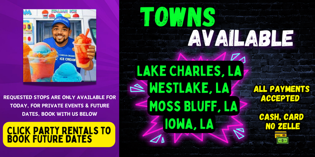 Requests are only available on the day we are out! Request a Stop today or Book your Party/Event below for a future date!